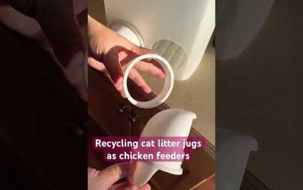 Recycling cat litter jugs as chicken feeders. Kit from Amazon https://amzn.to/3HgNwiI. #chickens Watch on YouTube